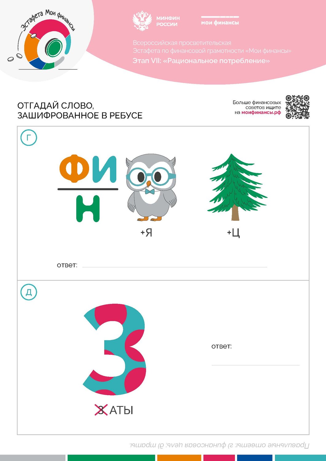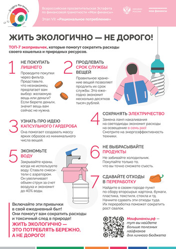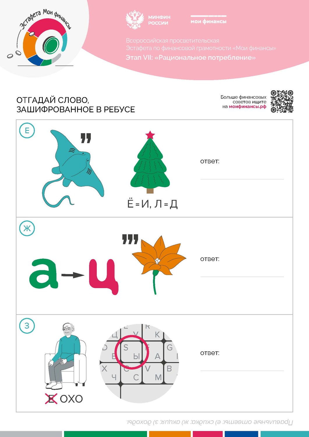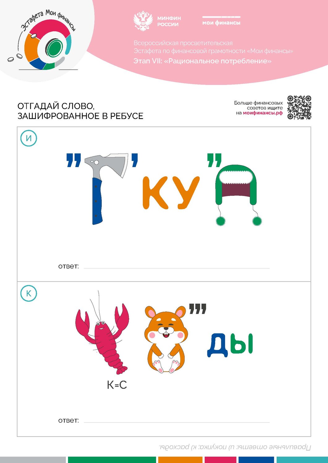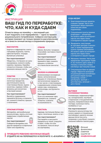 Рациональное потреблениеЖить экологично — не дорого! Ваш гид по переработке: что, как и куда сдаем Мини игра Финансовый перевертыш 7 главных выводов осознанного потребителя Как не нахватать лишнего на распродажах: Раскраска Рациональное потребление Ребусы Трекер спонтанных покупок Как избавиться от ненужных вещей Чек-ап спонтанных покупок
